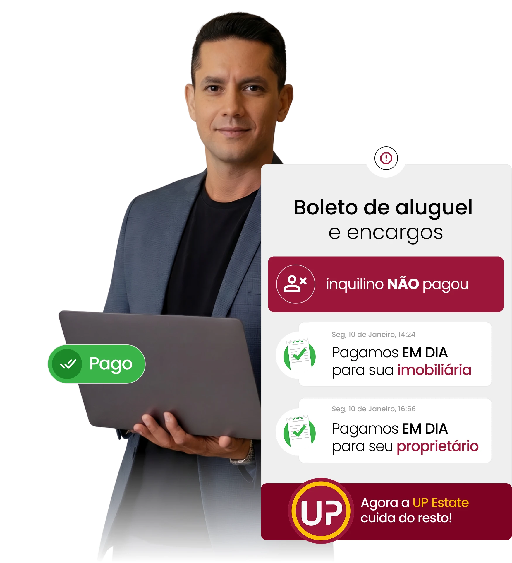 Através de parceria com fundos de investimentos, a UP Estate garante que o proprietário recebe o aluguel todo dia 15, independentemente do inquilino atrasar ou não pagar e depois se responsabiliza pela cobrança extrajudicial, abertura de sinistros e ação de despejo. Muito além do aluguel garantido é o aluguel garantido sempre em dia.